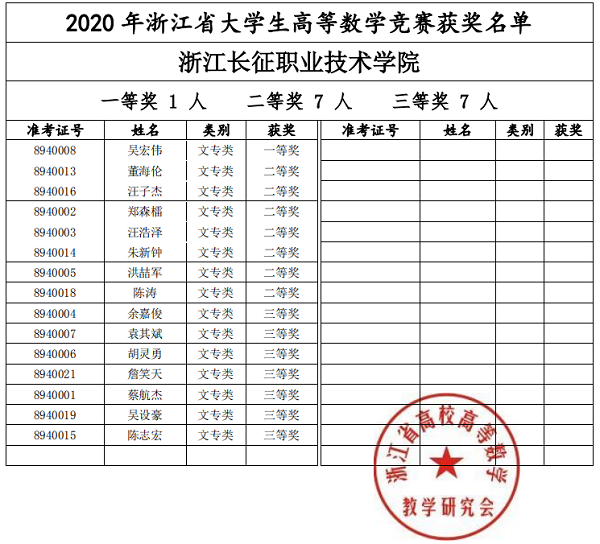 1月14日,由浙江省高校高等数学教学研究会组织的2020年浙江省大学生高等数学竞赛拉开帷幕。比赛分为数学、文科与专科、工科、经管等4个大类,我校组织学生参加了文科和专科类竞赛,经过激烈角逐,最终吴宏伟同学荣获一等奖,董海伦、汪子杰等7名同学荣获二等奖,余嘉俊、袁其斌等7名同学荣获三等奖。