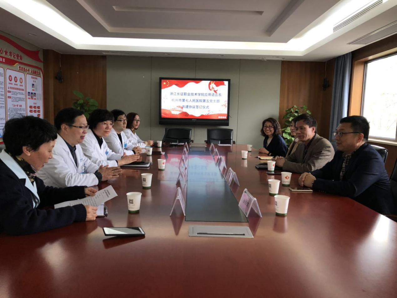 语言系党员教师陈贵青博士自2015年以来,就与市七医院建立了联系,并与该院脑功能研究室的专家一起,共同翻译社会认知康复训练方面的外文资料、编制国外心理测量量表的中文修订版、为患者医疗和康复训练提供咨询服务等。此次双方签约后,杭州市第七人民医院将正式成为应用语言系社会服务实践基地。双方将在为七院儿童科提供志愿者服务和课程辅导,为长征教师提供压力管理、放松训练讲座,为学生开设心理健康教育讲座等方面展开务实合作。