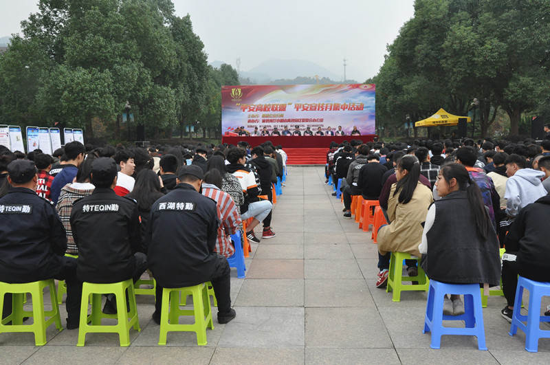 11月5日下午,由西湖区公安分局主办,小和山高教园区管委会办公室承办的“平安高校联盟”平安宣传月集中活动启动仪式在我校举行。副院长许迈进出席启动仪式并致辞,西湖分局党委委员、副局长程军,杭州市局经文保支队副支队长周青松,省教育厅小和山高教园区办主任陈雷,留下派出所所长祝匡海、副所长金玉荣,“平安高校联盟”成员高校保卫处处长出席仪式,园区内近400名师生参加本次活动。