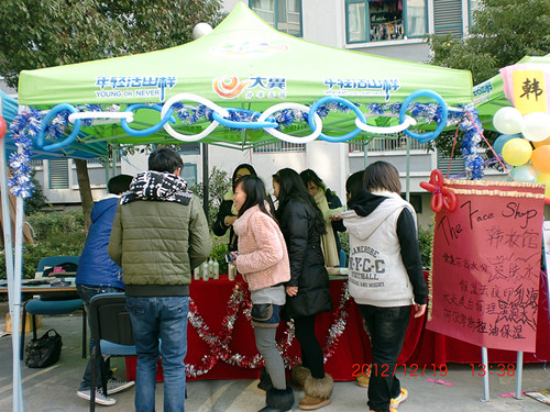 在学院10号-12公寓楼中间的广场上,十支参赛队伍搭成了两排商品街,玲琅满目的韩国护肤品及彩妆形成了一片独特的风景区。迎着朝阳,参赛选手们搭台陈列,开始了一天的比赛。促销形式多种多样,比赛场面火爆热烈,参赛选手们充分发挥团队精神、合理分工、采用了各种促销手段拉动销售额,来创出促销的佳绩。经过一天的促销比赛,最后产生一等奖1组,二等奖2组,三等奖3组和优胜奖2组。