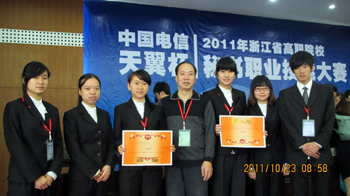 2011年10月22至23日,语言系文秘专业09级赖诚晟、殷佳、林静与10级杜盼盼、刘俊江、郭洋6位同学在黄明光老师带领下代表我院首次参加由浙江教育厅组织的浙江省高职院校文秘职业技能大赛,荣获团体三等奖。这次比赛在湖州职业技术学院举行。参加本次大赛的共有来自浙江省19所高职院校的42组选手。语言系6位同学分为两个小组参加了比赛。