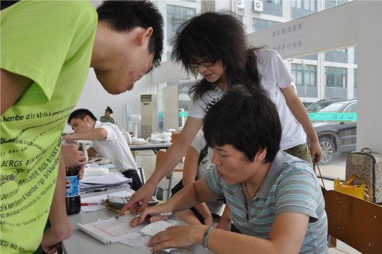 在学院图书馆和体育馆前广场上,新生报到处、咨询处,区域划分明确,标牌提示醒目,令人一目了然。在工作人员的相互配合、共同努力下,各区域工作进展有条不紊,在志愿者的协助下,各工作台前排起一条条整齐的队伍,秩序井然有序。新生在志愿者的帮助下,按照报到流程,迅速办理入学手续,领取生活用品。学生处和招就处专门设置了绿色通道,为新生和家长答疑解惑。
