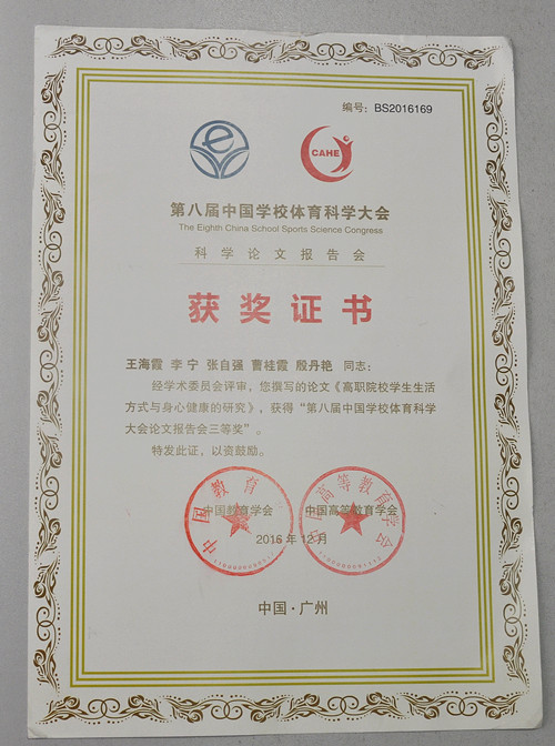 近日,收到中国教育学会、中国高等教育学会联合颁发的获奖证书,我院王海霞、张自强、曹桂霞、殷丹艳四位教师共同获得此奖项。本此评审工作在广州举行,四位位老师的论文《高职院校学生生活方式与身心健康的研究》经大会组委会专家评审,获得三等奖。
