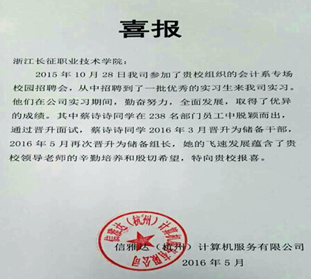 我院2013级会计系学生蔡诗诗,从2015年11月起进入信雅达(杭州)计算机服务有限公司公司数据中心实习;在同批学生中(分别来自省内及省内高校)共238名学生中,她通过自身勤奋努力,全面发展,取得了优异的成绩;短短3个月就通过晋升面试,并在 2016年3月晋升为储备干部,2016年5月再次晋升为储备组长,她的飞速发展蕴含了我院会计系老师的辛勤培养和殷切希望;在此表示祝贺。(会计系供稿)