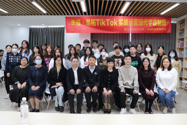 为使跨境电子商务专业群的学生能够对TikTok Shop有更全面、深入的认知,获得真实的TikTok Shop短视频运营和跨境直播实战机会,并且在跨境电商领域的专业技能和创业能力方面得到提升,商贸学院与杭州昂拓贸易有限公司共同启动了基于TikTok 实战运营的跨境电商现代学徒制班项目,并于近日在学校图书馆举行了开班仪式,教务处副处长吴少俊、商贸学院院长王珍、杭州昂拓贸易有限公司副总经理许新、跨境电商运营总监金开,商务与贸易学院教师代表和20位学徒制班学员参加了此次开班仪式。