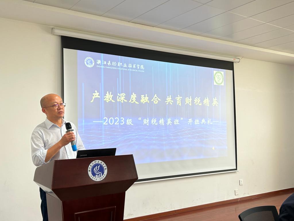 张彪在致辞中代表杭州市代理记账行业协会对2023级“财税精英班”同学的加入表示热烈的欢迎和诚挚的祝贺。他指出,“财税精英班”的成立是学院与中联集团长期友好合作的结晶,并对“财税精英班”的培养理念给予了高度肯定。他对首届“财税精英班”提出三点期望:一是期望重构教与学的关系,注重培养学生的兴趣,在项目实践中深化知识运用,师生互相尊重、信任,在教育过程中共同成长;二是期望通过一系列课程学习,使精英班学员们能够珍惜学习机会,认真学习,提升认知和能力,学有所获,成为招之能来、来之能战、战之能胜的实战性人才;三是期望在大家的共同努力下,把首届“财税精英班”打造成校企协合作的标杆。
