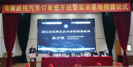 仪式上,吴少俊代表学校对海康威视一直以来在校企合作育人方面给予学校的大力支持表示肯定和感谢,他表示,海康威视汽车订单班是学校与海康威视在产教融合方面的新平台,期待订单班能够实现“立德树人、回归原点,思路领先、解决痛点,模式创新、突破难点”,切实推动教育链、人才链、产业链与创新链有机衔接,为区域经济发展提供高素质技能人才支撑。