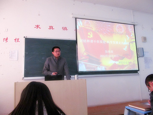 全体与会人员先认真地观看了胡锦涛同志的报告视频,然后由张凤老师宣读了系党总支制定下发的关于《财务管理系学习、宣传、贯彻十八大精神的通知》(浙征职财党2012〔13〕号文件),最后由党总支副书记陆栋煜老师作了题为“团结和谐干在实处、科学发展走在前列”的专题报告。